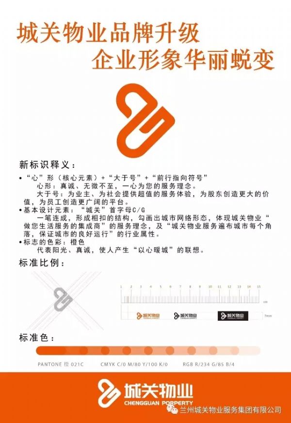 標(biāo)識是企業(yè)品牌使用頻率最高的視覺符號,是形成品牌視覺形象的核心元素,還是品牌形象的象征與精神體現(xiàn)。城關(guān)物業(yè)服務(wù)集團(tuán)新企業(yè)標(biāo)識采用了橙色,代表陽光、真誠,使人產(chǎn)生“以心暖城”的聯(lián)想。并將心形、大于號、前行指向符號作為核心設(shè)計元素集于一體。