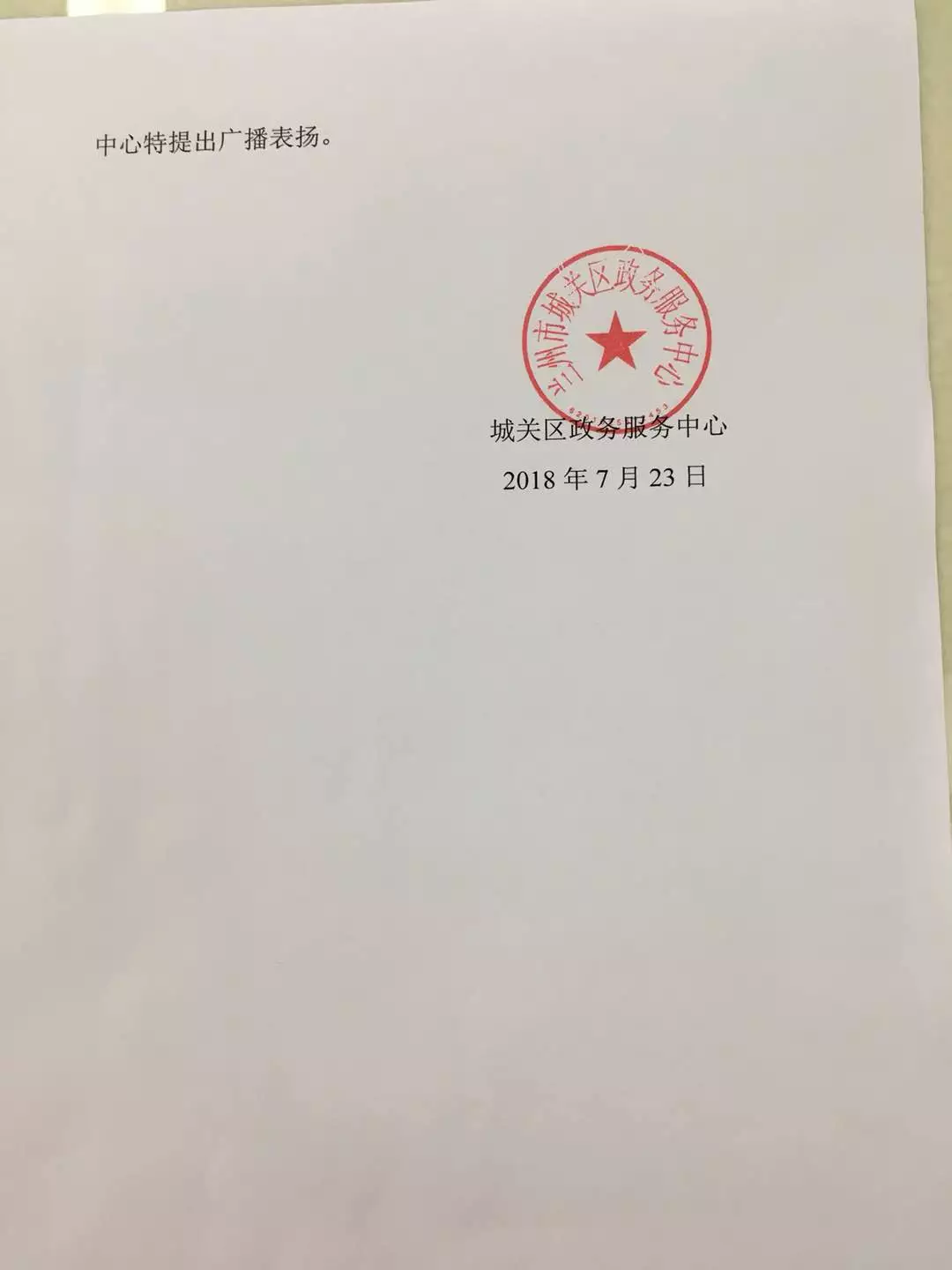 ▲城關(guān)區(qū)政務(wù)服務(wù)中心給城關(guān)物業(yè)馬文貴和余會(huì)明的感謝信