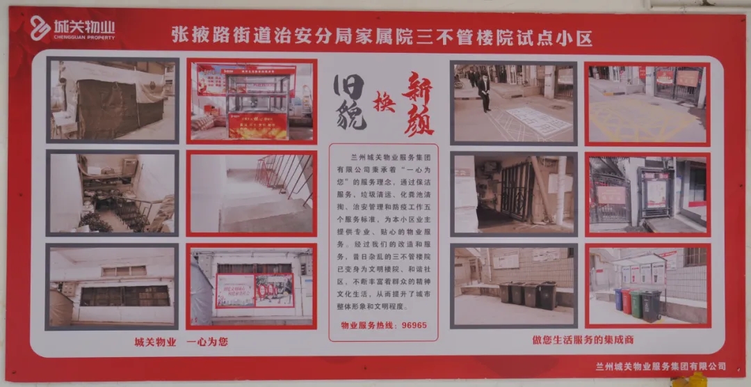 蘭州城關物業(yè)全面接管城關區(qū)老舊樓院后,采取先期介入、分層改造等新模式,啟動實施“三不管”樓院物業(yè)全覆蓋整治工作,通過環(huán)境衛(wèi)生改造,基礎設施維修,安全秩序維護等方面工作,把‘三不管’樓院變成‘三要管’。我們將繼續(xù)努力,持續(xù)推進城關區(qū)老舊樓院改造,不斷引入多元化服務,全面提升服務質(zhì)量,提升業(yè)主的幸福感和滿意度!