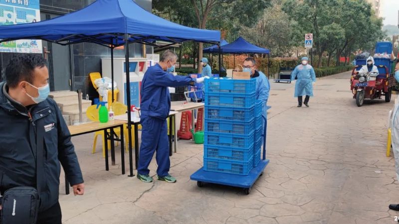 宋師傅是車隊司機之一,他開的是一輛中型貨車,一車能裝兩萬個饅頭,每天從早跑到晚,從東跑到西。“特殊時期,大家都辛苦,也不是我一個人這么拼!”宋師傅黑瘦精干,說話間一車饅頭裝齊又要出發(fā)了。11月10日下午3點左右,宋師傅運送饅頭的車停在安瀾祥園物業(yè)門口,“全副武裝”的物業(yè)工作人員早早等候在那里。大家搬運、分裝、分頭上門派送。每戶10個饅頭,先按5個用塑料袋分裝,再用專門訂制的綠色環(huán)保手提袋裝起來送到業(yè)主手中。