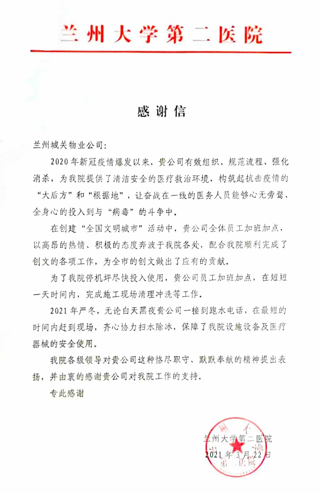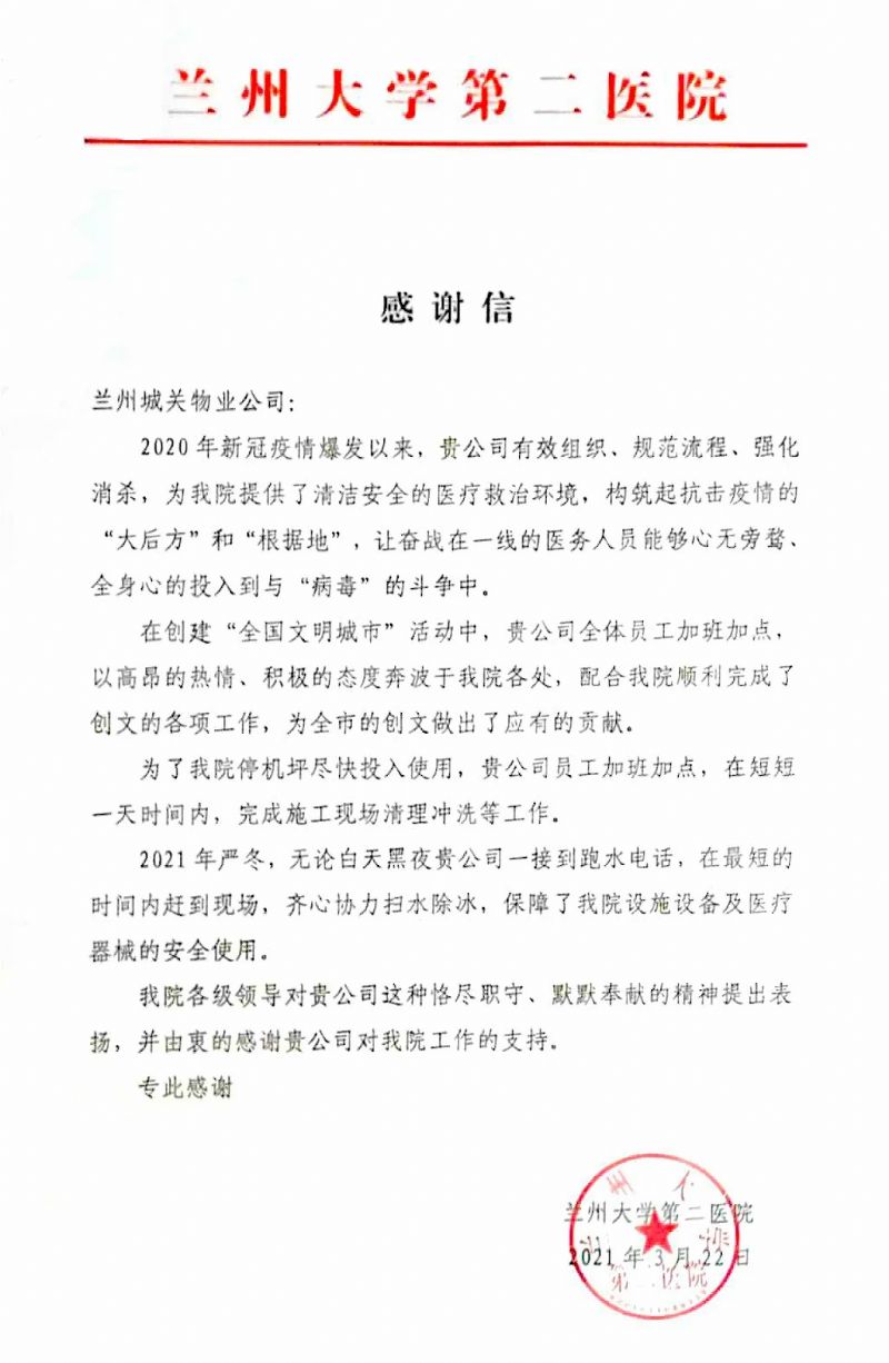 蘭州大學(xué)第二醫(yī)院后勤保障處劉處長一行人專程來到蘭州城關(guān)物業(yè)服務(wù)集團有限公司,將一面寫有“物業(yè)好管家 業(yè)主貼心人”的錦旗贈予蘭州城關(guān)物業(yè)服務(wù)集團有限公司總裁楊佳林手中,以此表達對于城關(guān)物業(yè)的感謝和認(rèn)可。劉處長表示,2020年新冠疫情爆發(fā)以來,城關(guān)物業(yè)有效組織,規(guī)范流程,為醫(yī)院提供了清潔、安全的醫(yī)療救治環(huán)境,與醫(yī)院一起構(gòu)筑起抗擊疫情的“根據(jù)地”。城關(guān)物業(yè)加班加點保障醫(yī)院后勤的同時,積極配合醫(yī)院順利完成各項創(chuàng)文工作,為蘭州市創(chuàng)建全國文明城市做出了應(yīng)有的貢獻。